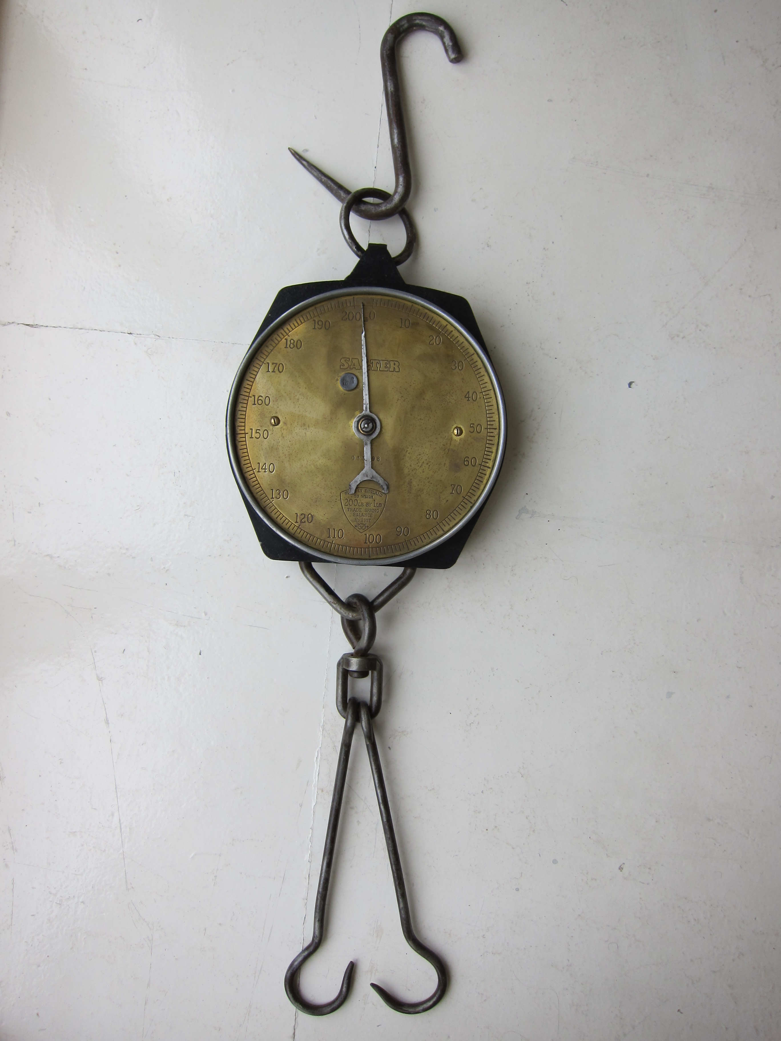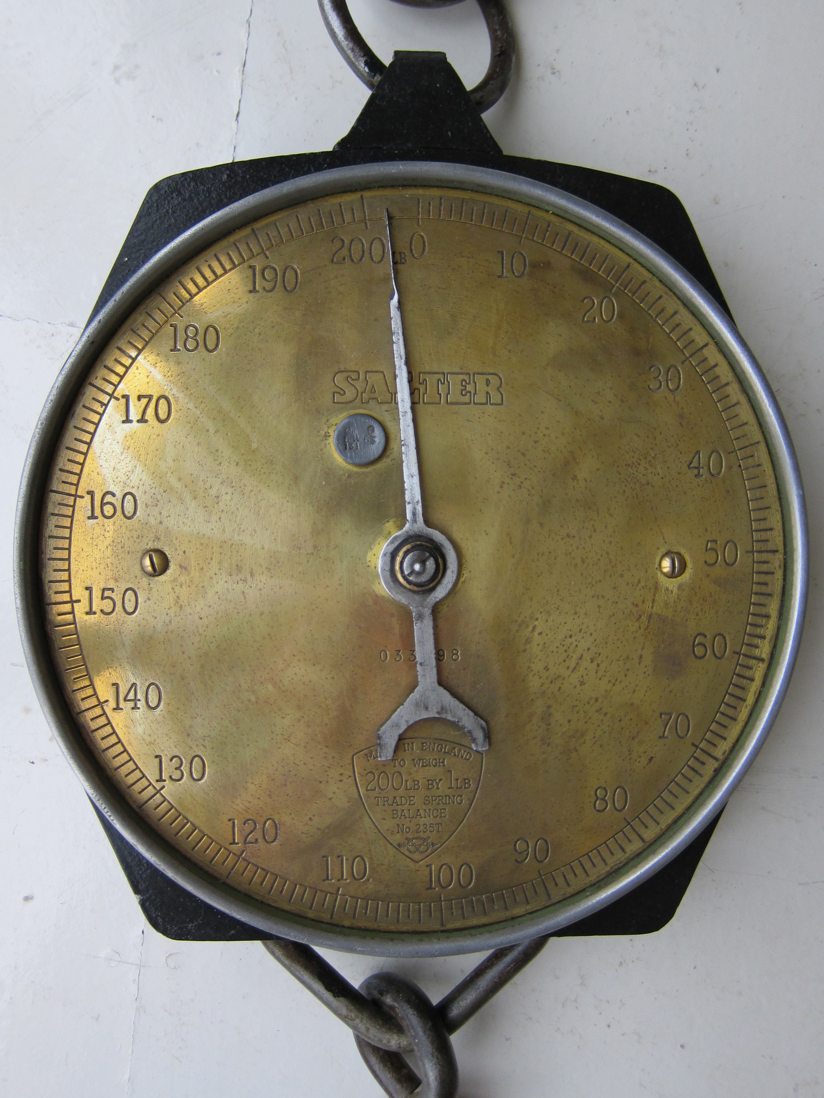 Salter trade spring balance and hook. Weighs 200lb in 1lb intervals. Made of brass, iron and aluminium, the model 235T was manufactured from 1910 to 1936.
