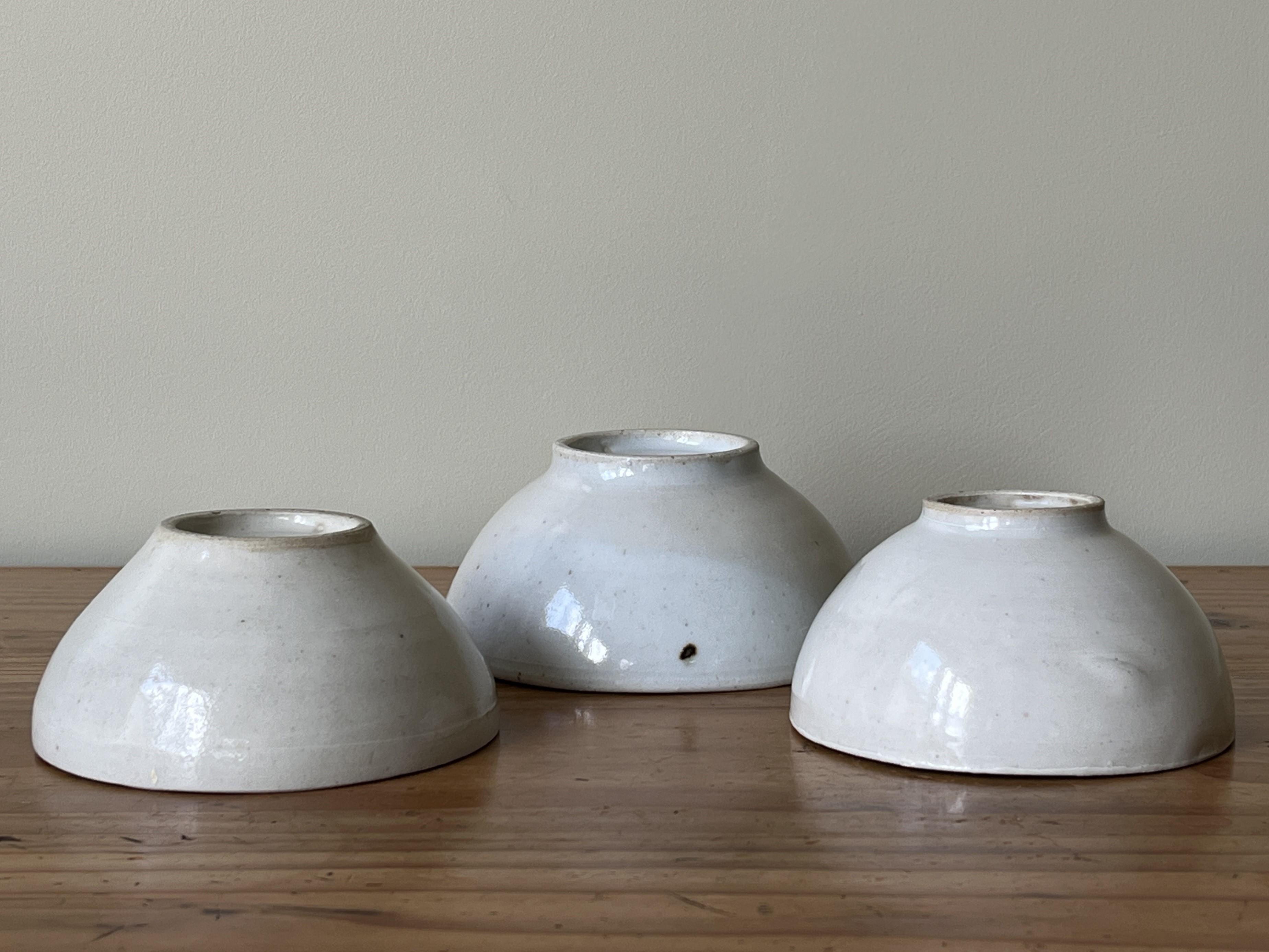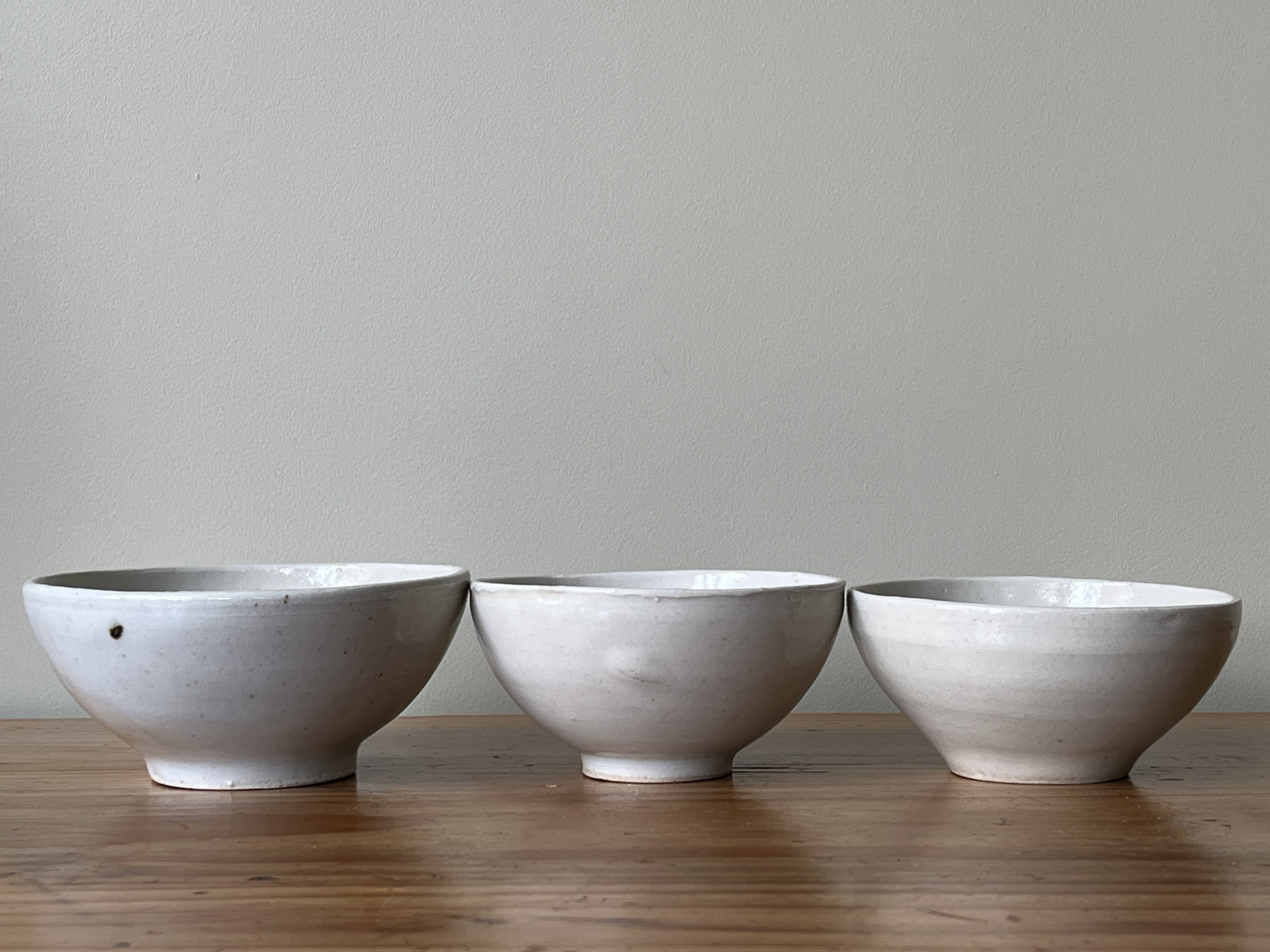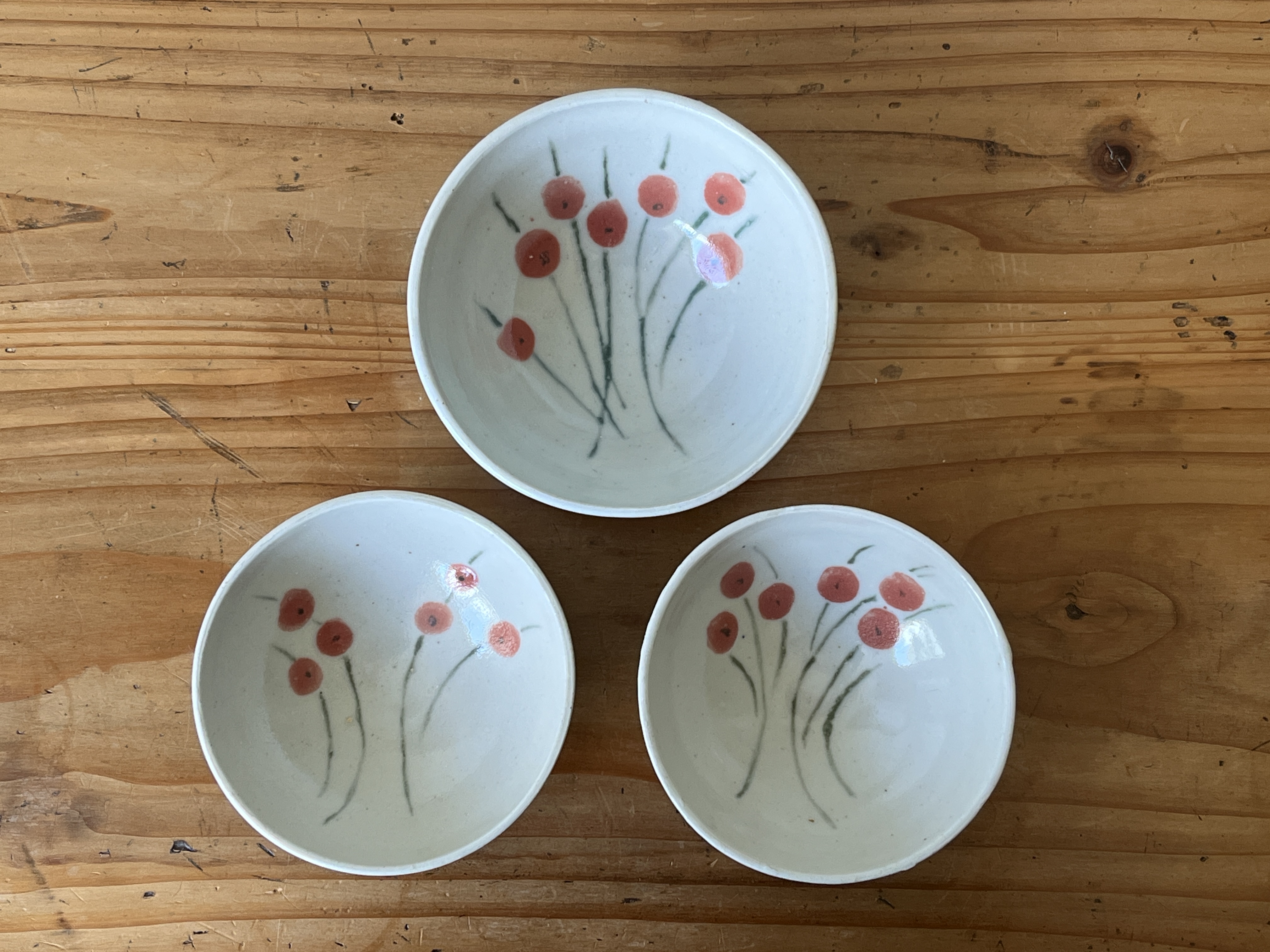Three bowls made in Shigaraki, Japan, with a cherry design. Likely made in the 1970s, these are handmade according to tradition, showing natural variations in the clay, making and glazing, considered to be part of the aesthetic of Shigaraki ware – shown in the images. The larger bowl has a Japanese potter’s mark. No cracks, chips or nibbles.