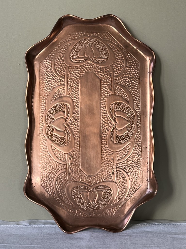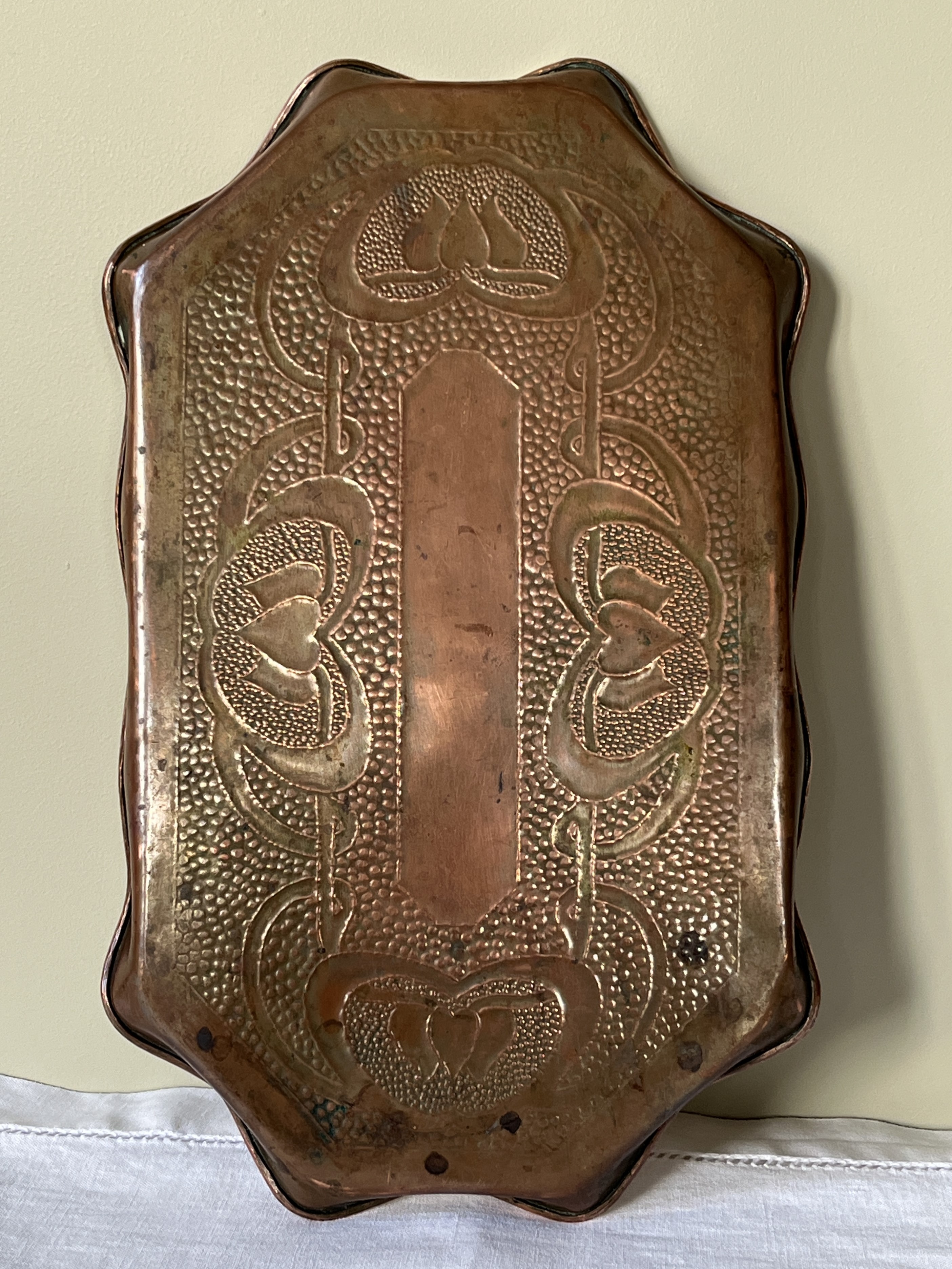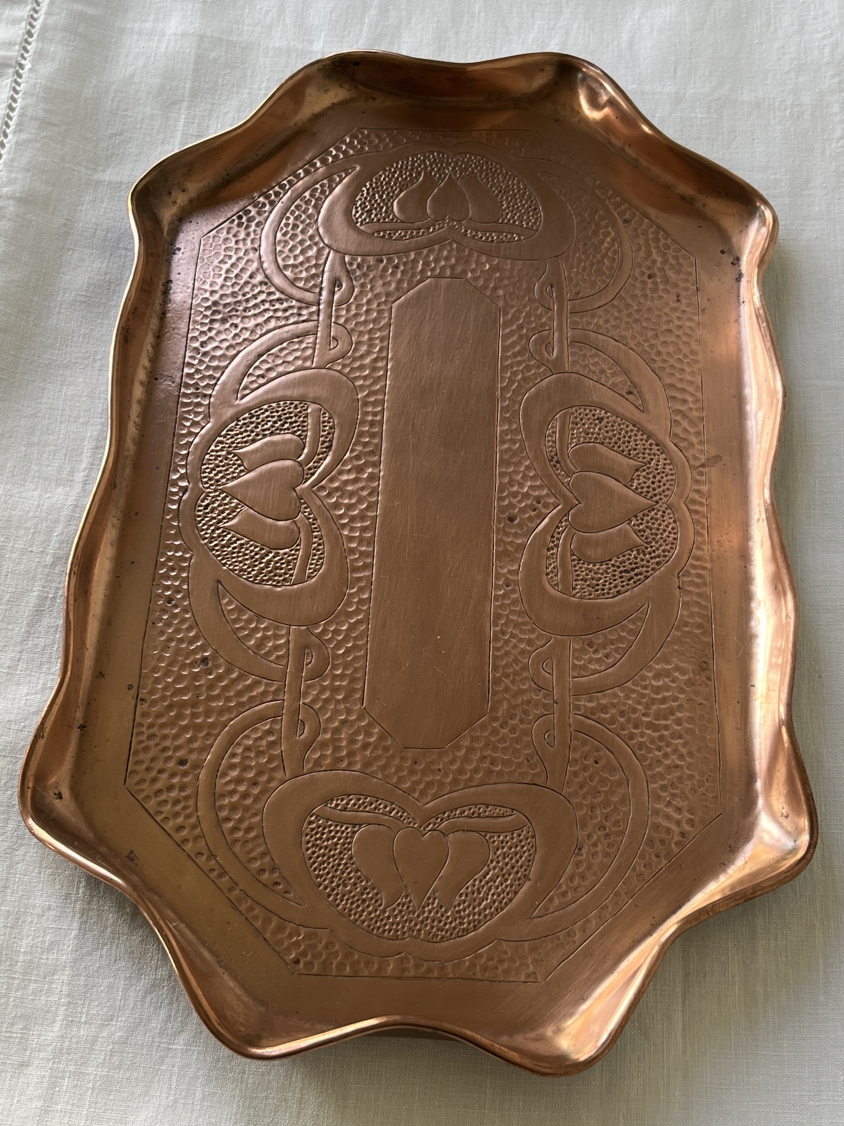 Handcrafted copper tray with a repoussé, low relief, hearts design. Almost certainly handmade by Charles Eustace, who had been a wages clerk at J & F Pool, an engineering company in Cornwall that produced arts and crafts decorative copperware in the early 20th century. Eustace later reinterpreted the company’s designs and handcrafted trays like this one in his shed to sell to tourists, which have since become collector’s items.