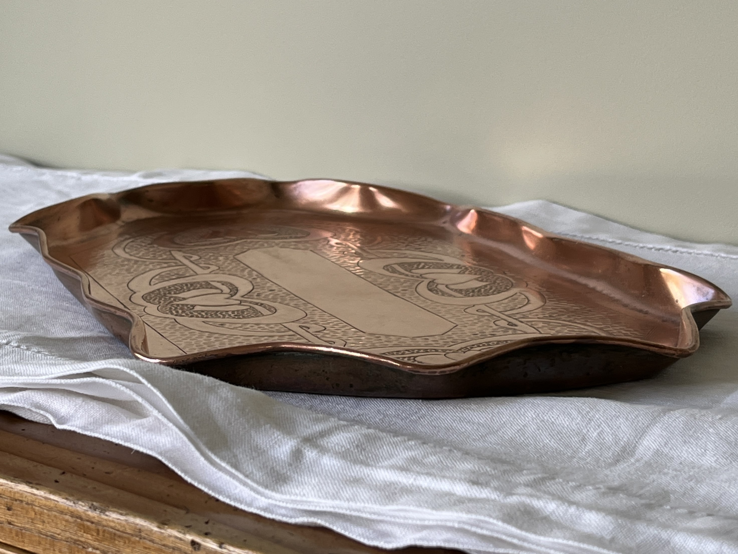 This tray has been polished to remove unsightly dark stains on the top surface. It’s bright sheen will gradually darken again; faster, if exposed to sulphur. (Rotorua has a natural advantage there…) The underside retains an aged patina.