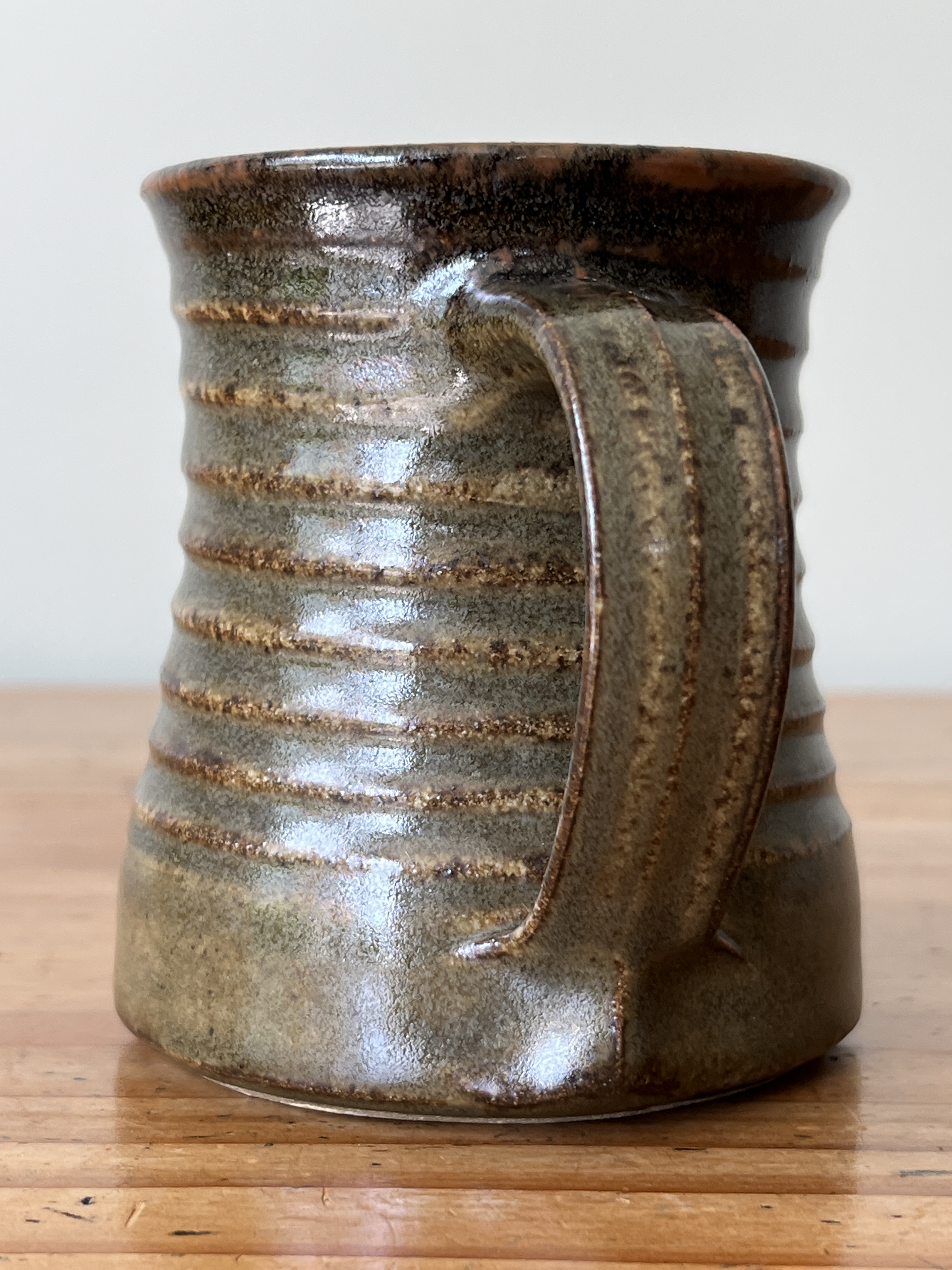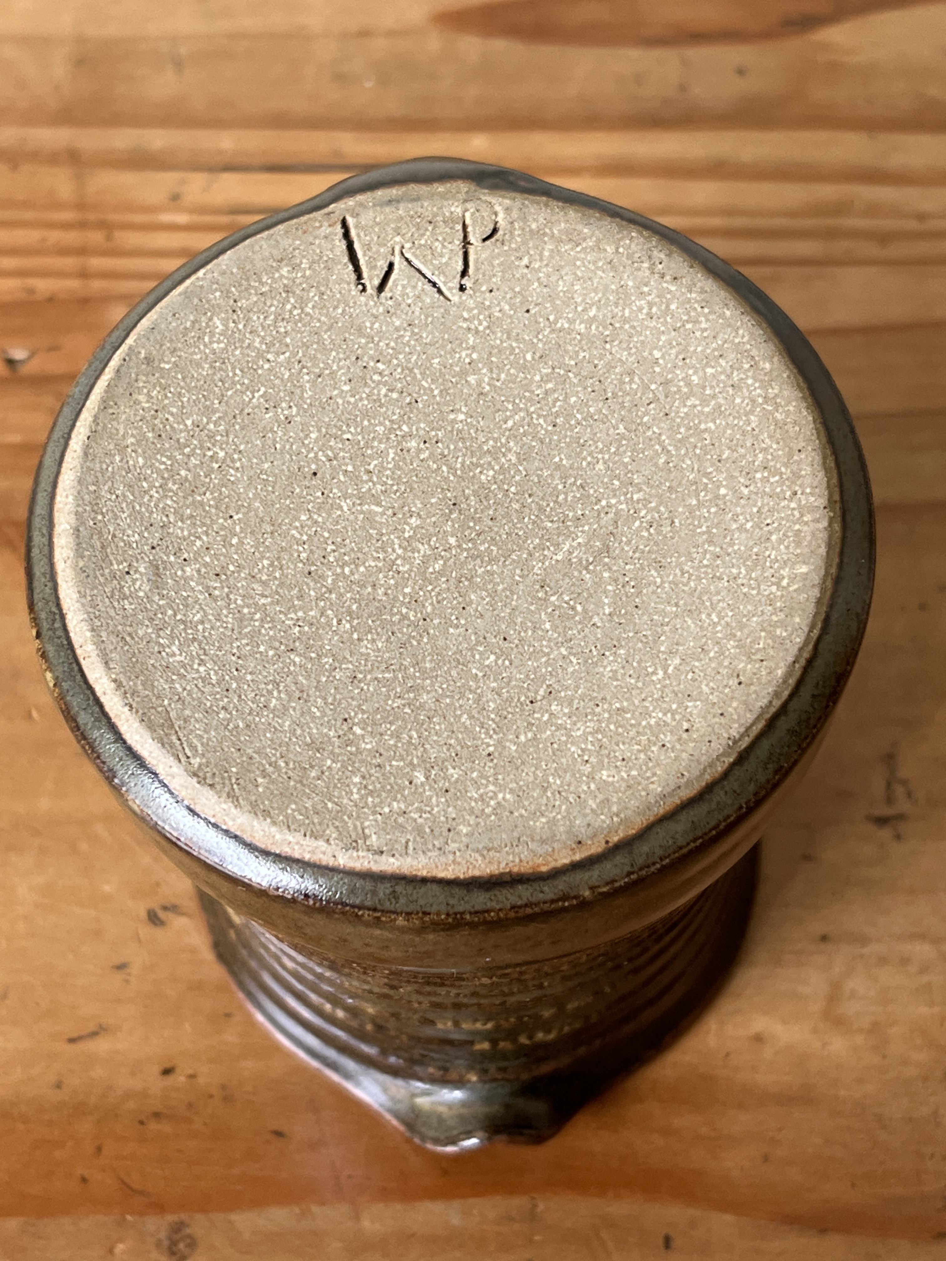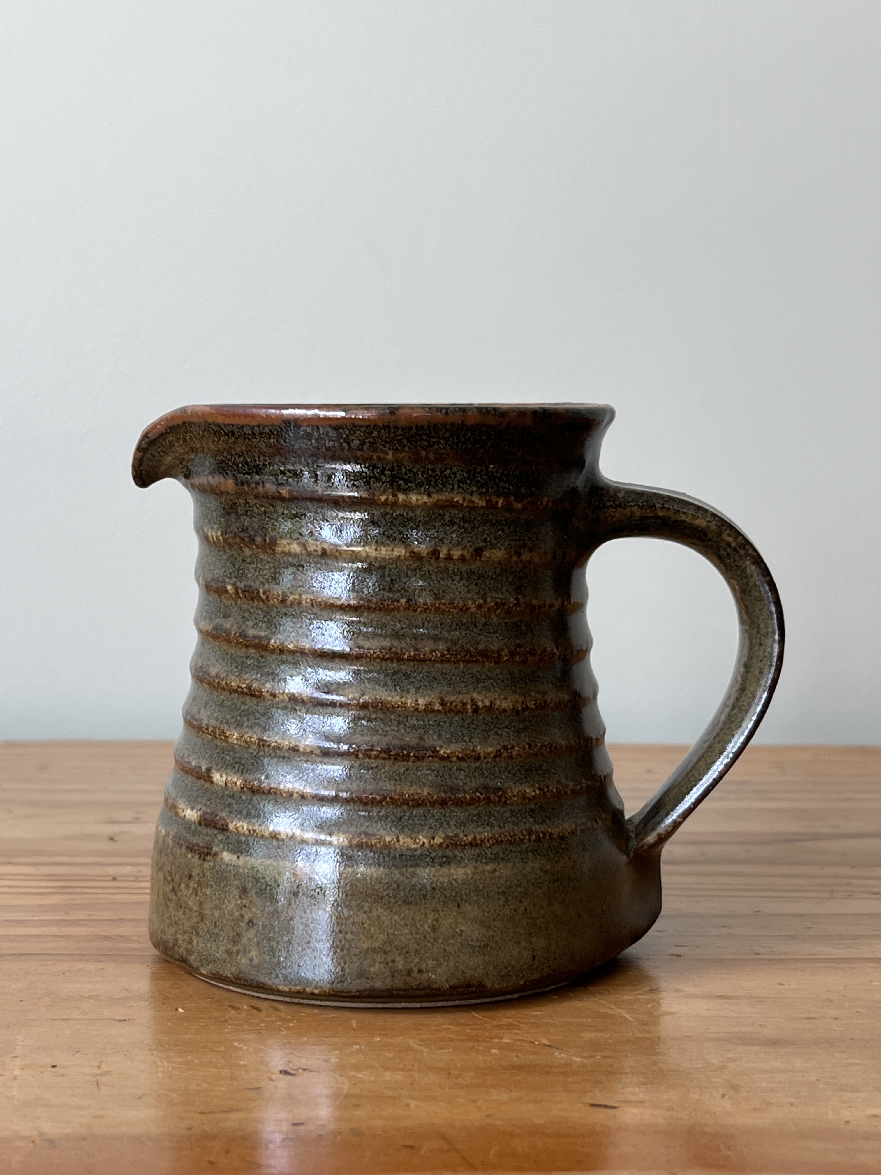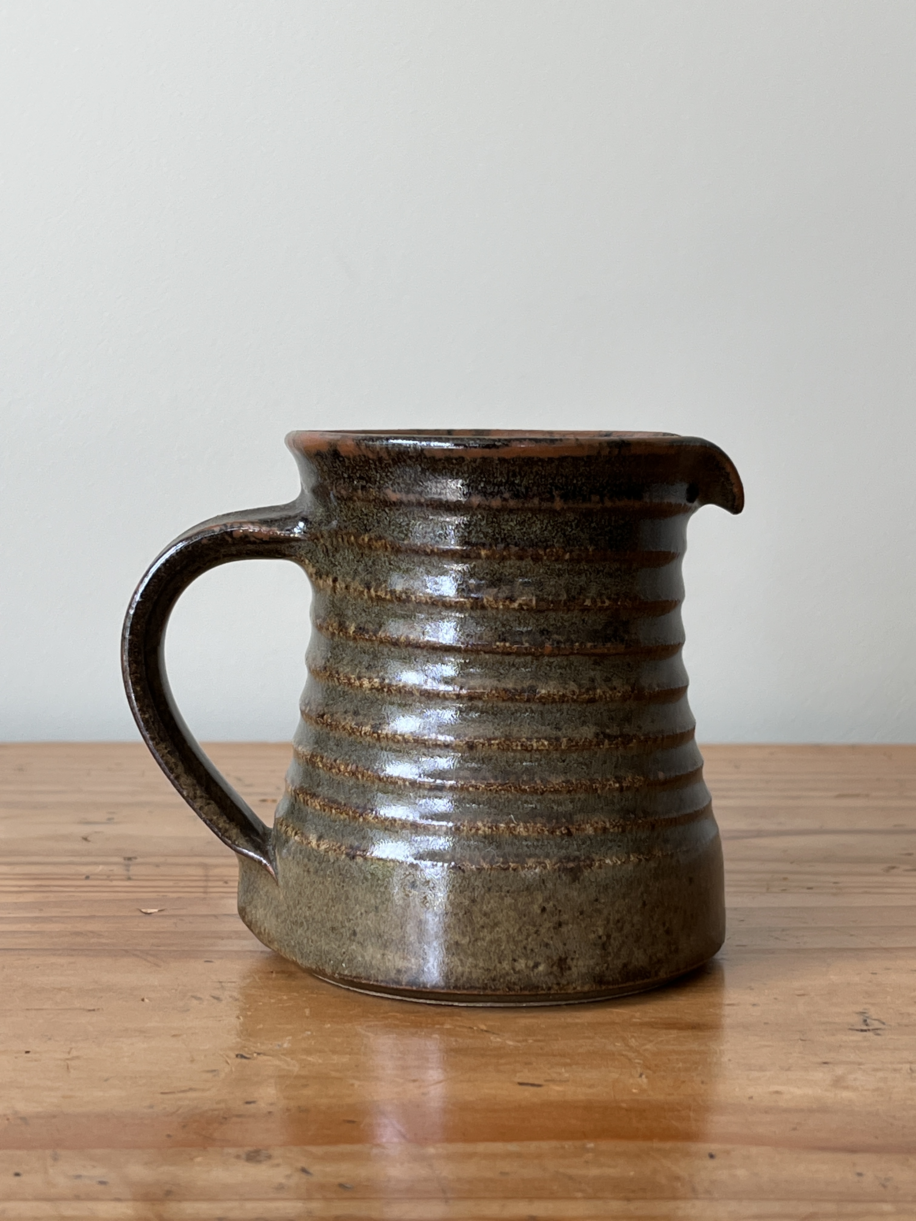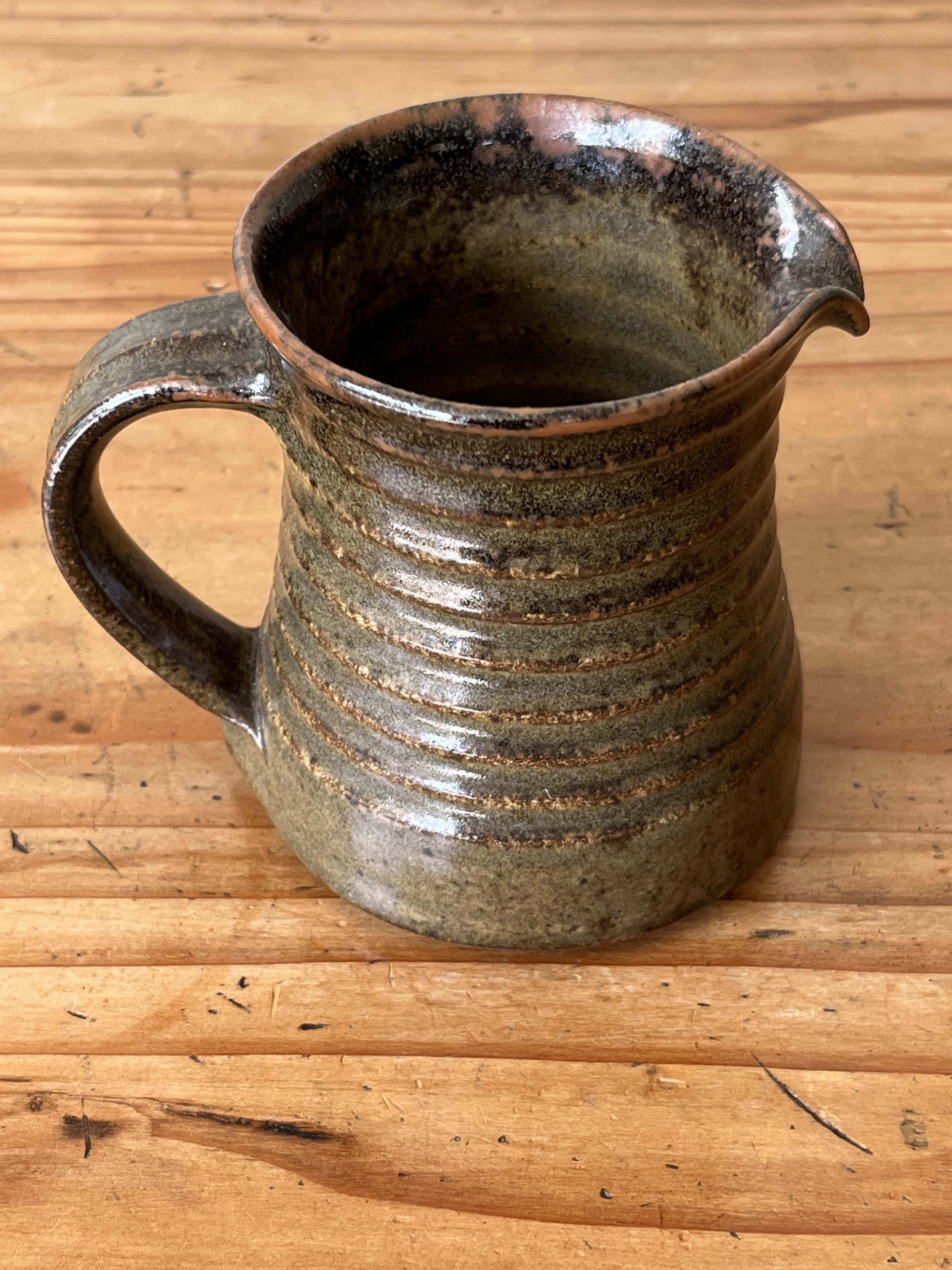 Green-glaze, ribbed milk jug by Waimea Pottery, with the potter’s mark on base.