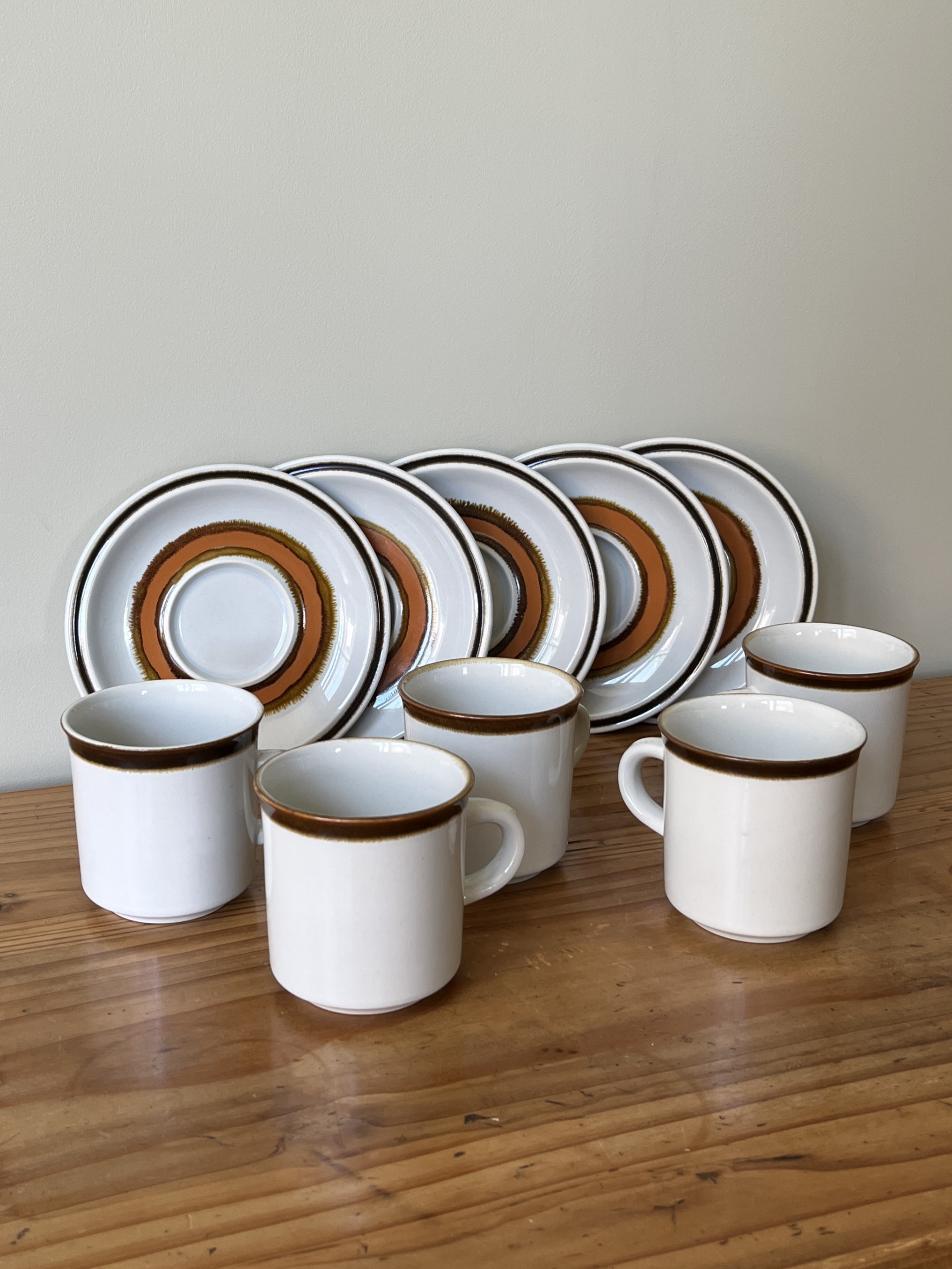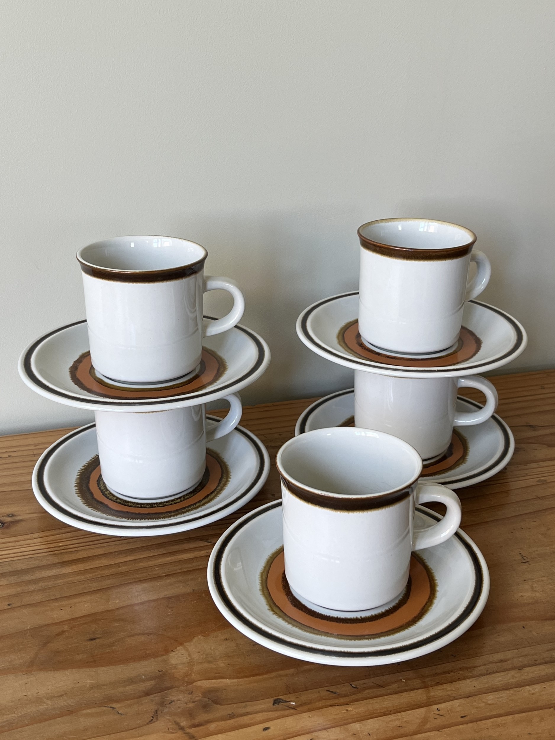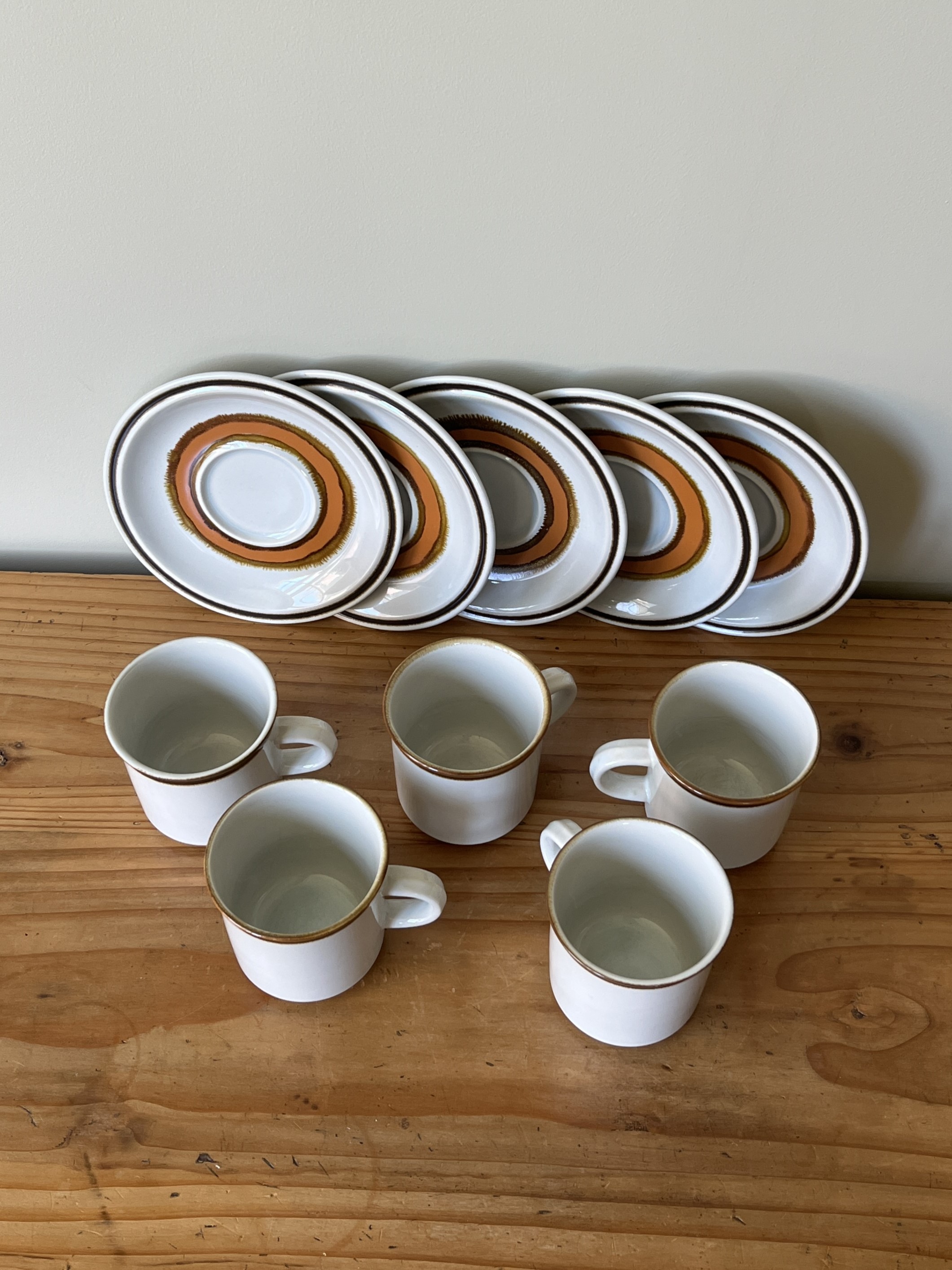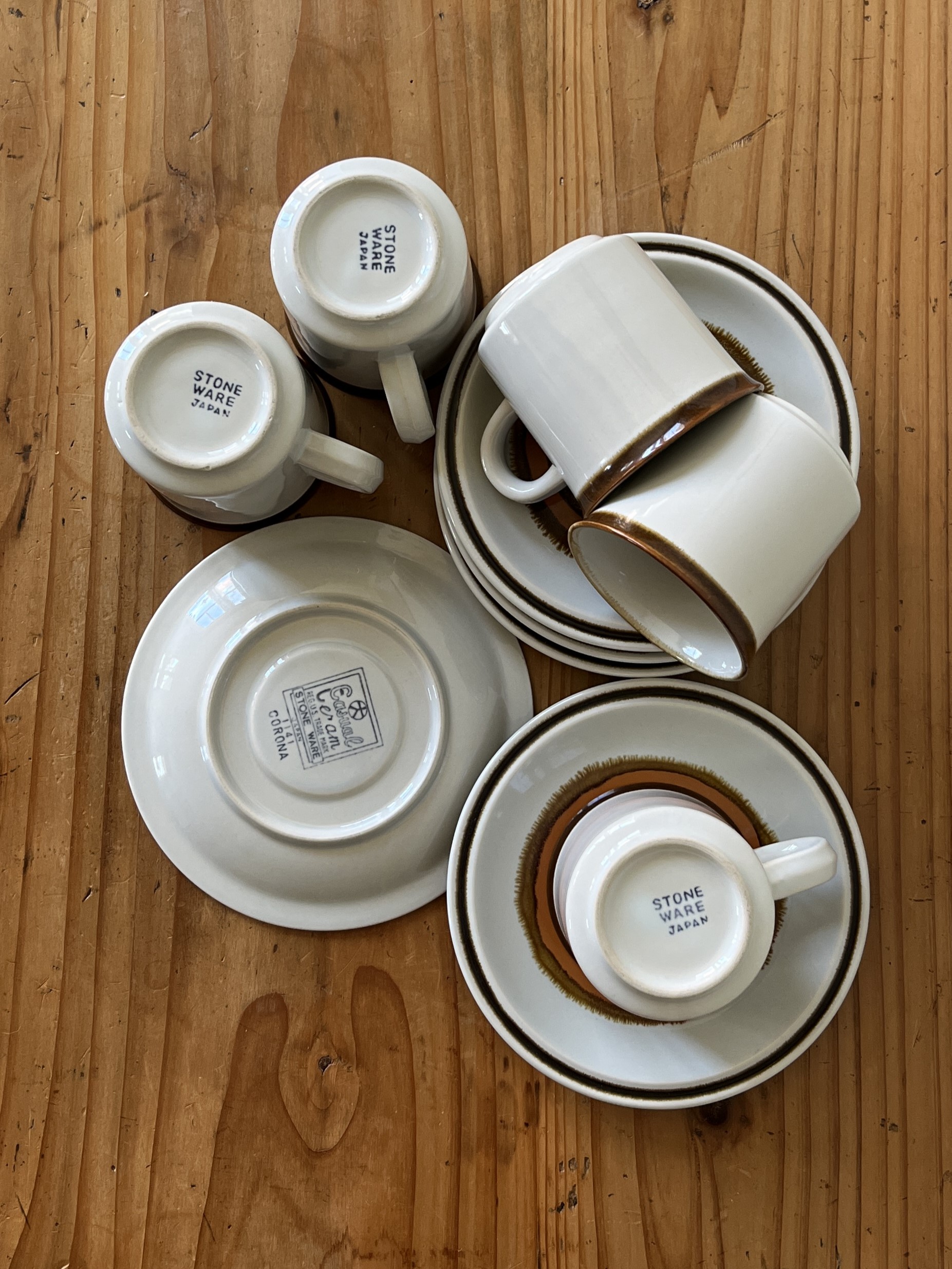 Palest grey stoneware with a burnished brown and rust orange drip glaze. Five duos in the set. Made by Acsons, Japan, in the 1970s for everyday use with high durability – and still going strong. The design is Corona, number 1141, marked on the base of the saucers. Acsons is no longer operating and these are considered collectible.