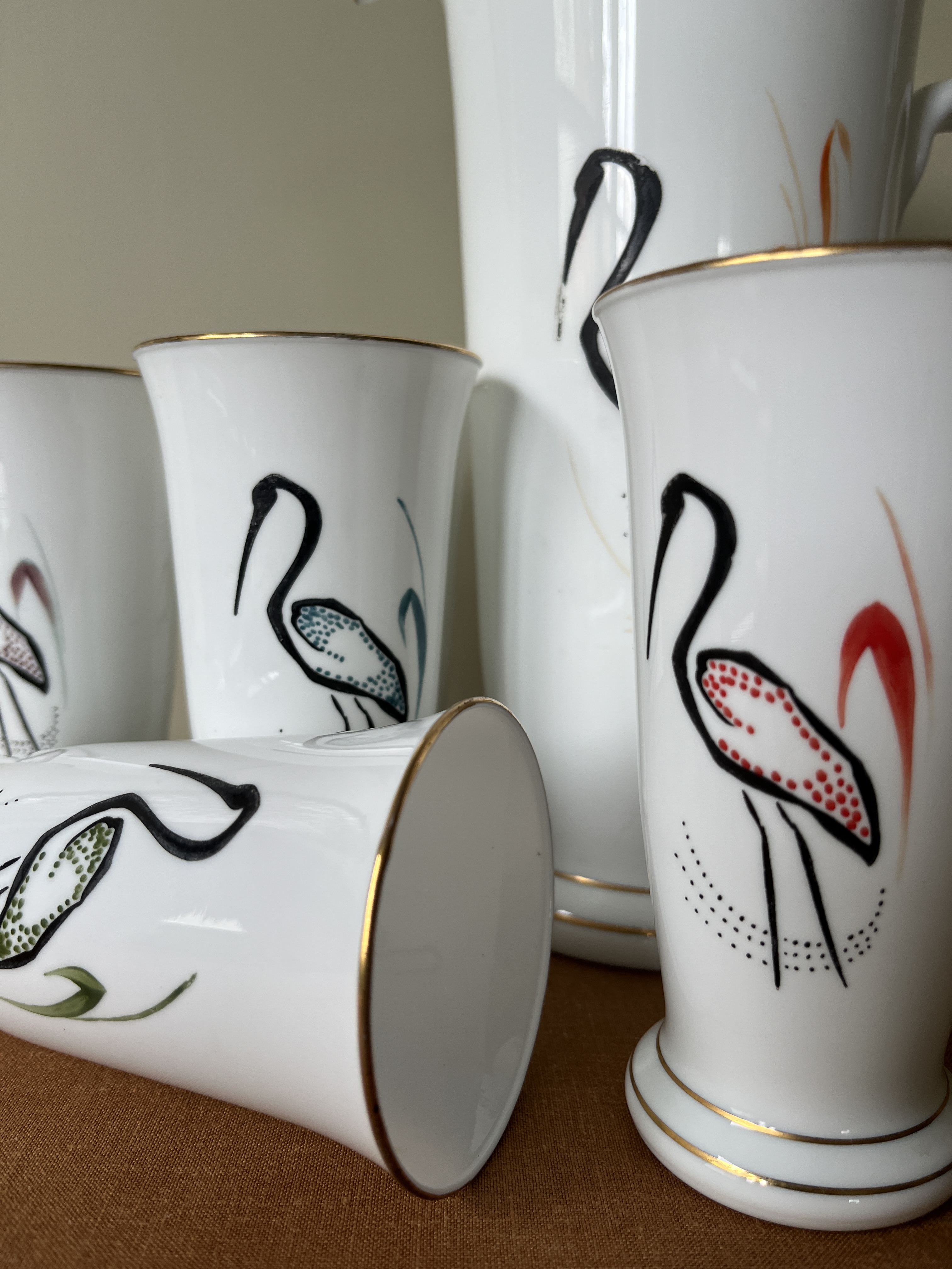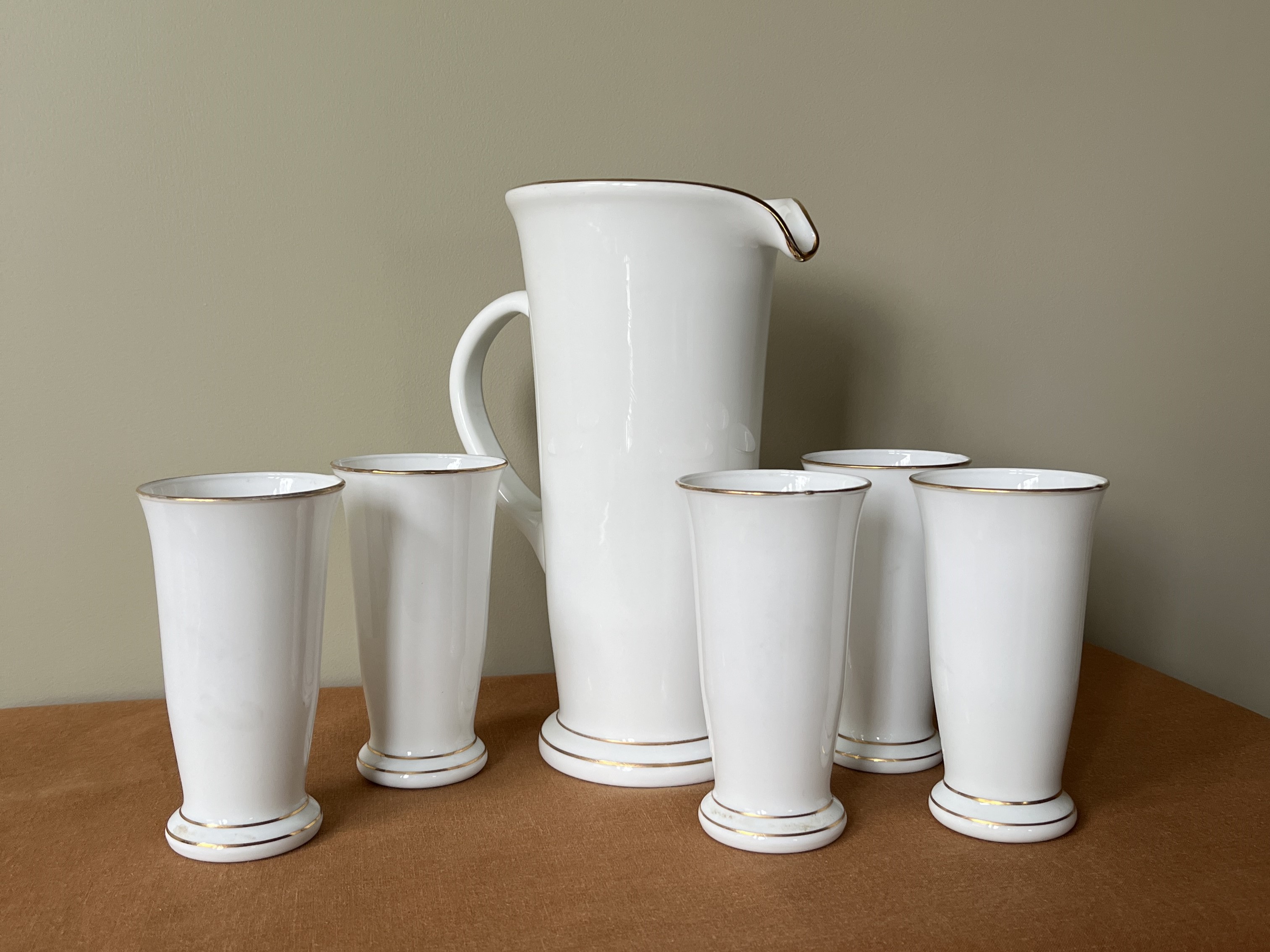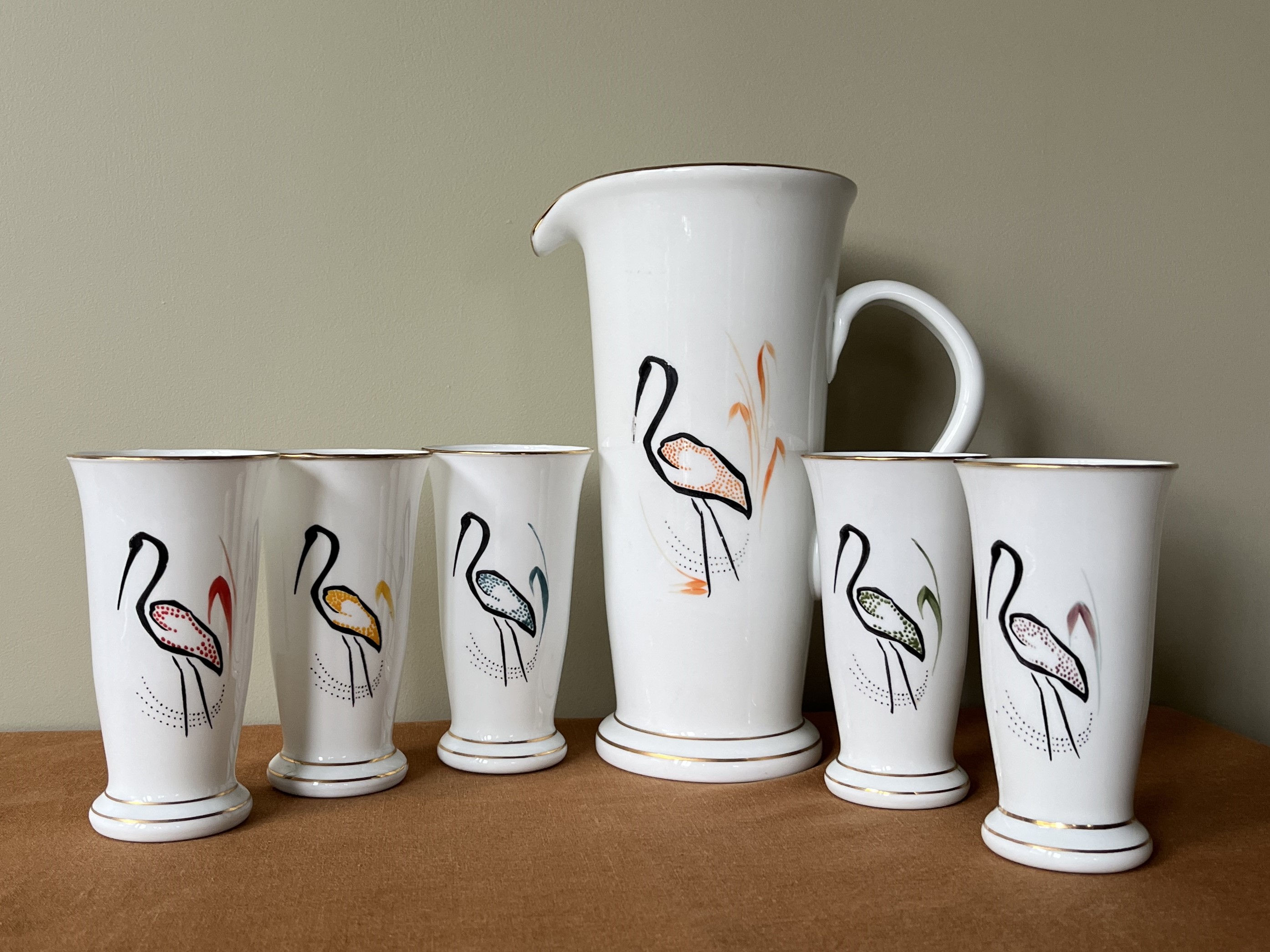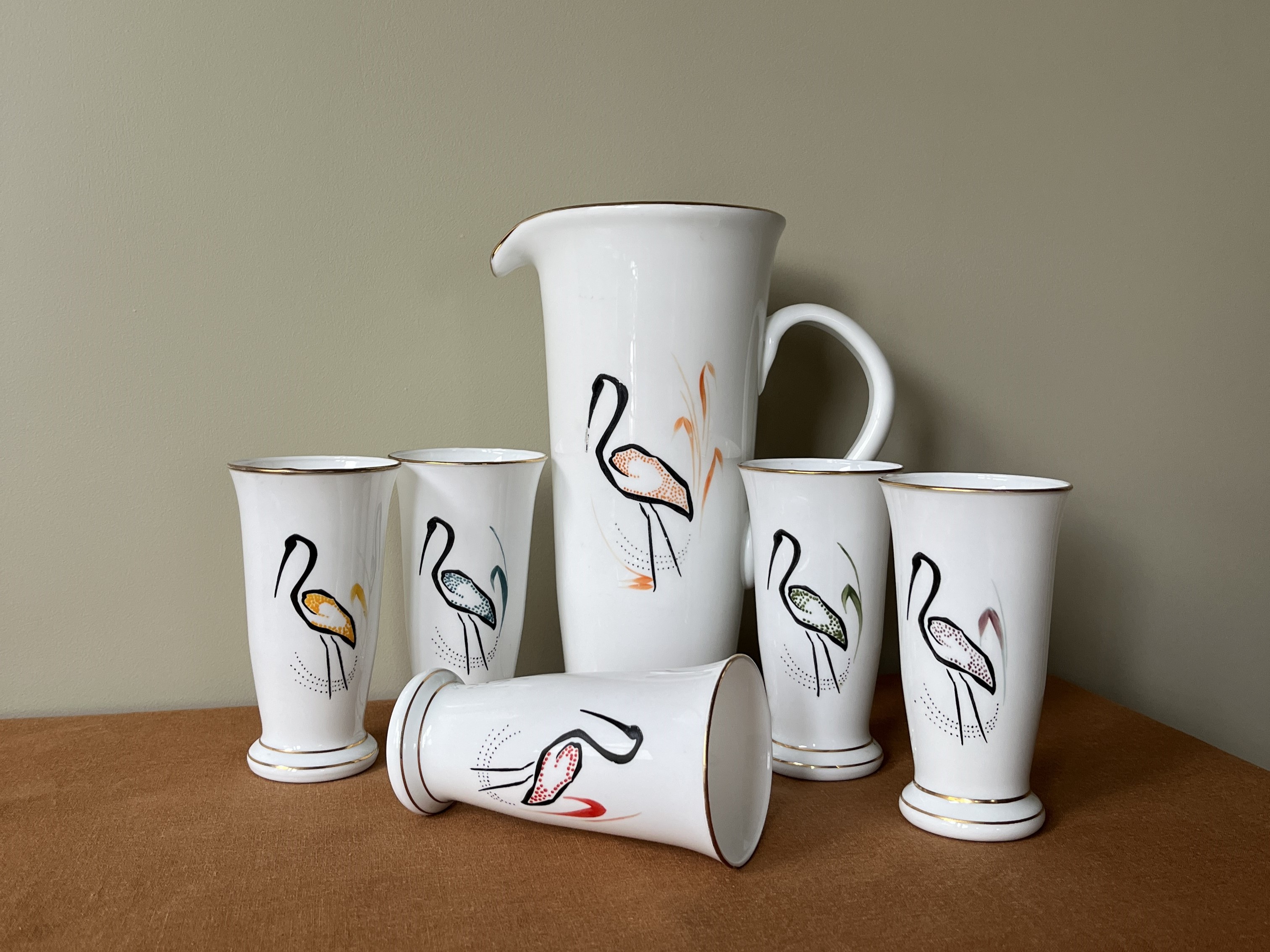 Post-war opaline juice set, hand-painted with a chorus of flamingos in soft, sun-washed colours and finished with gold banding. The set includes a generous pitcher and five tumblers.