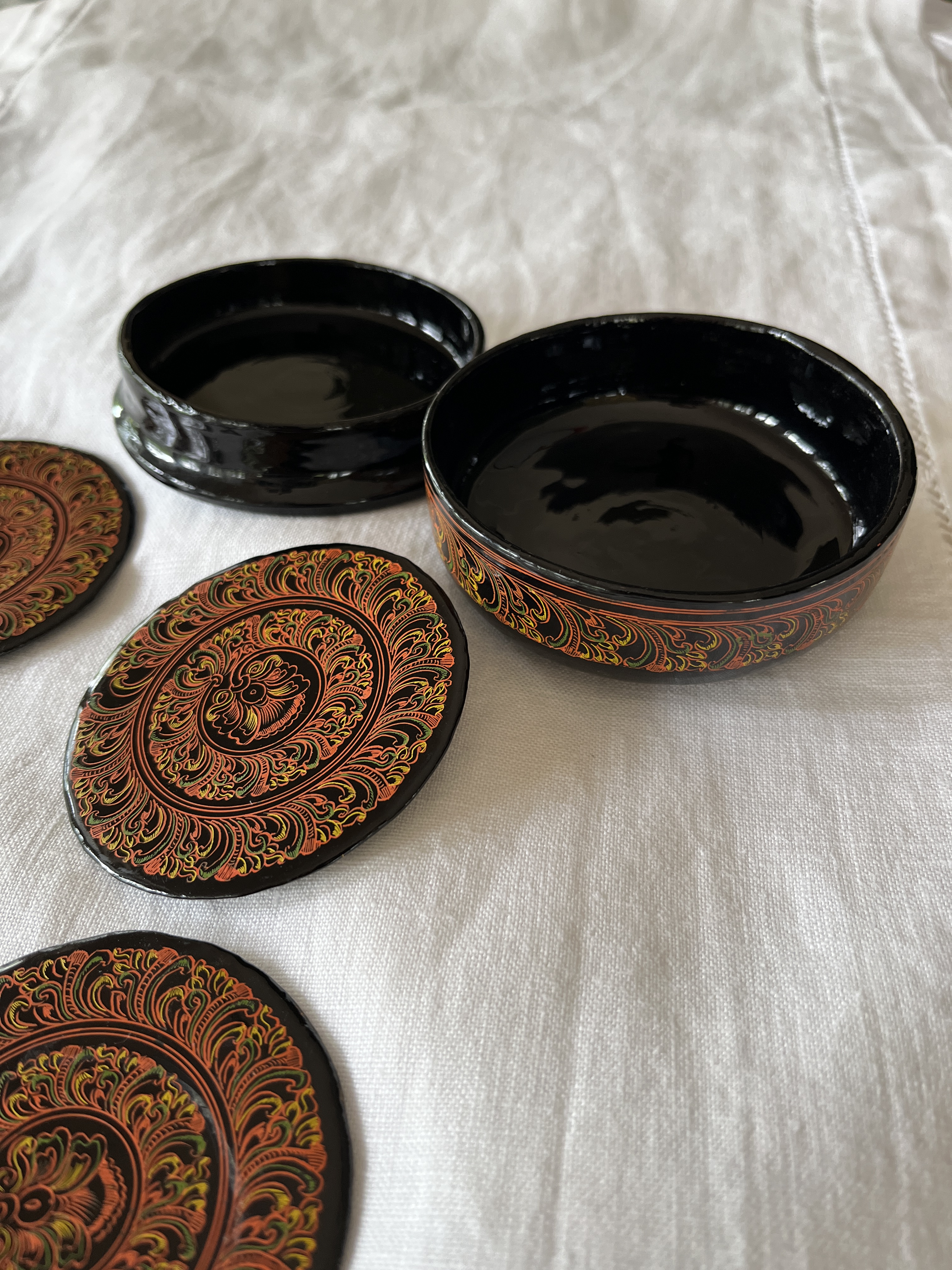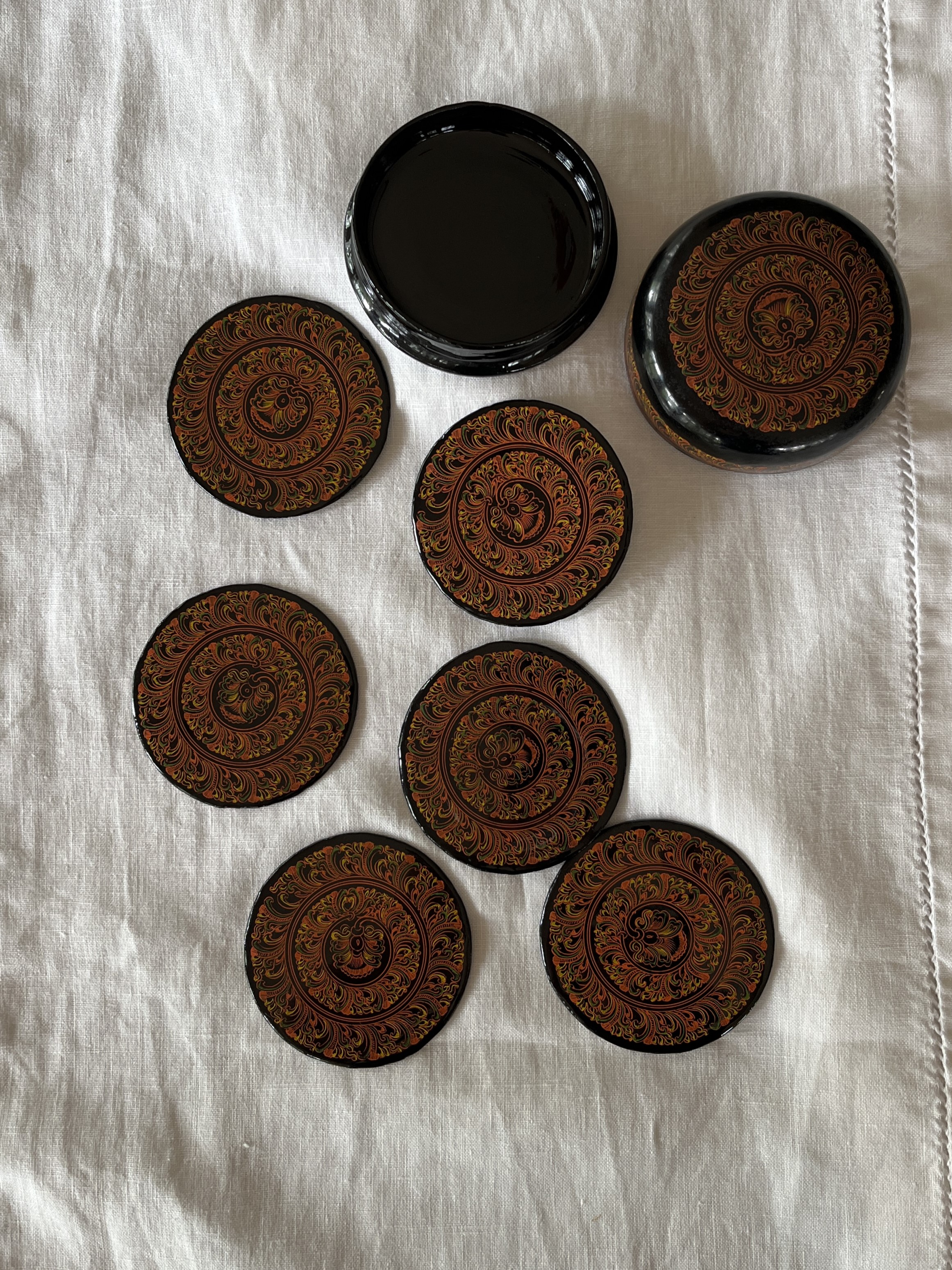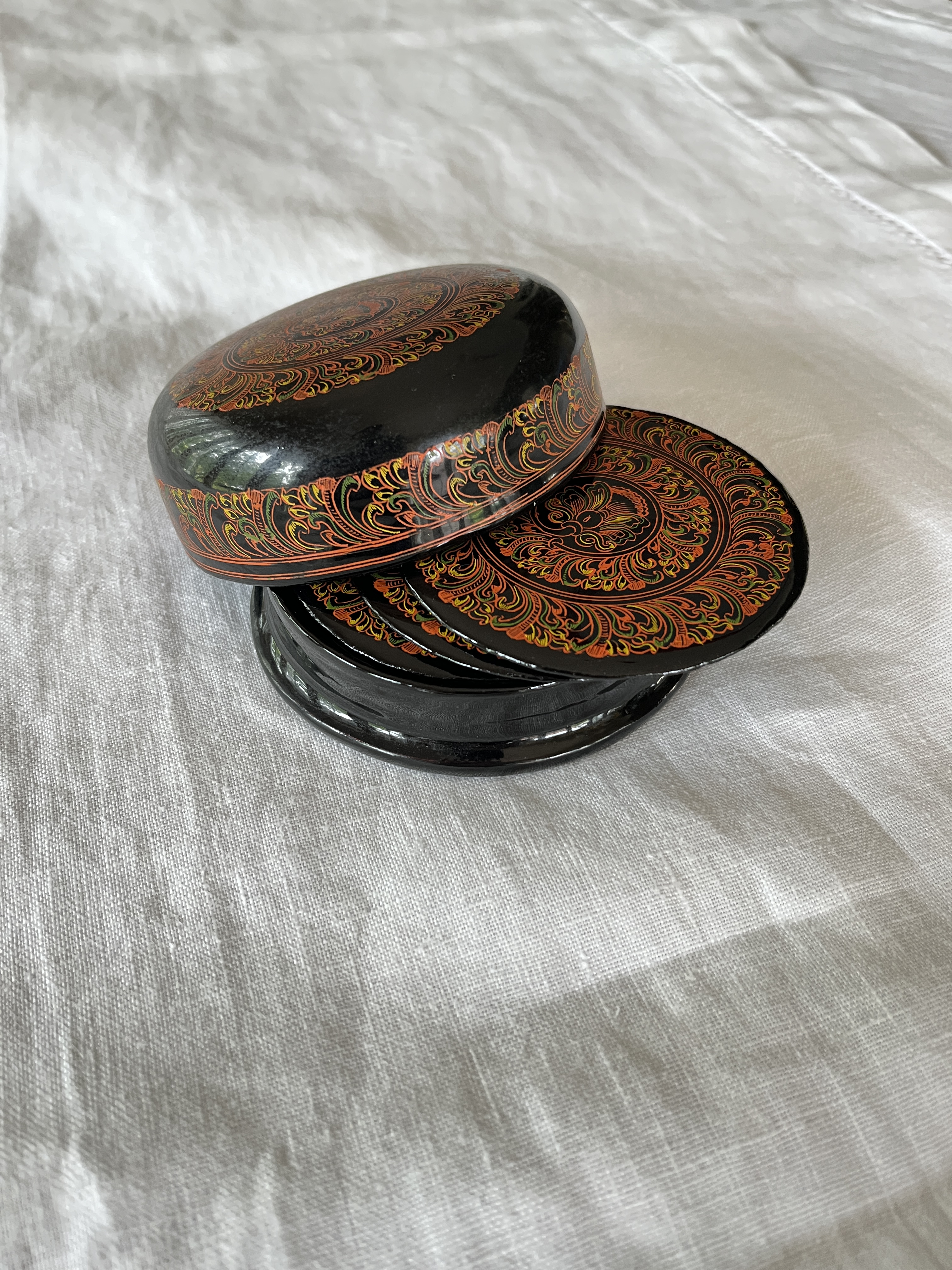 Lacquered round box with six lacquered coasters. These have an applied design in orange, green and yellow swirls. Funky and exotic.
