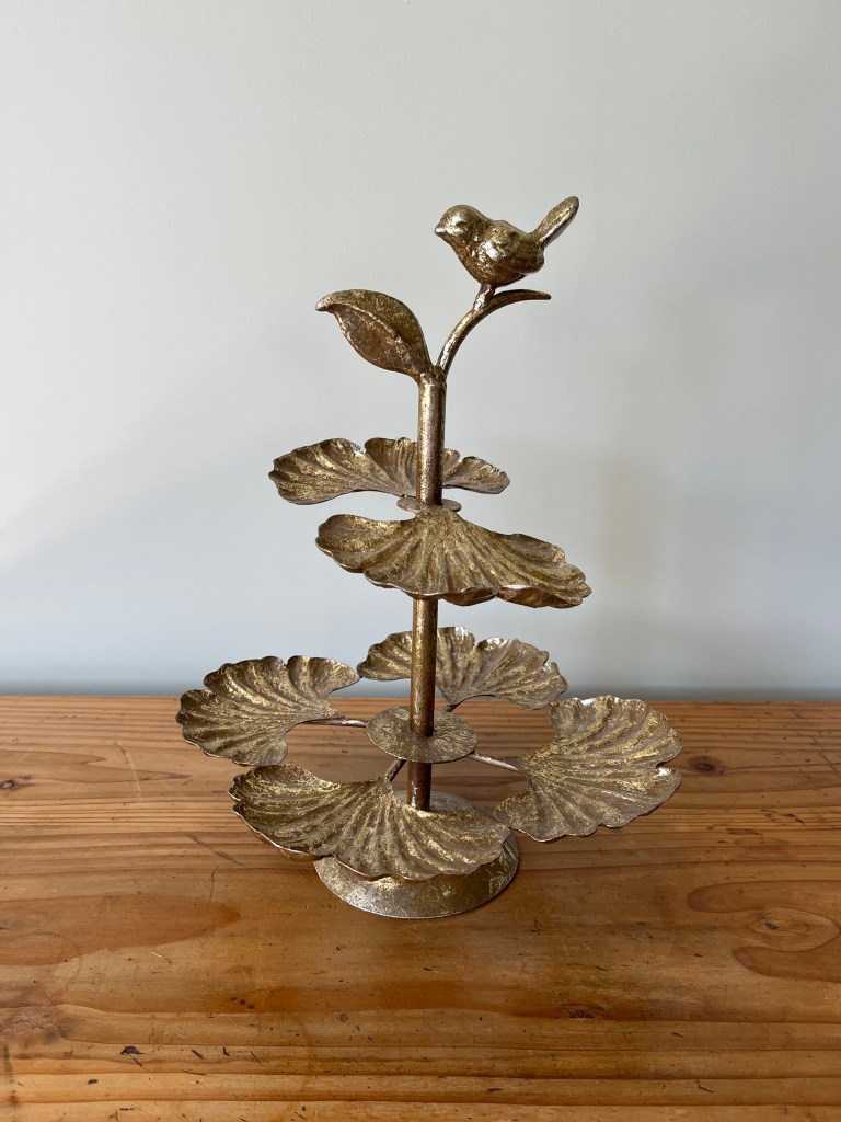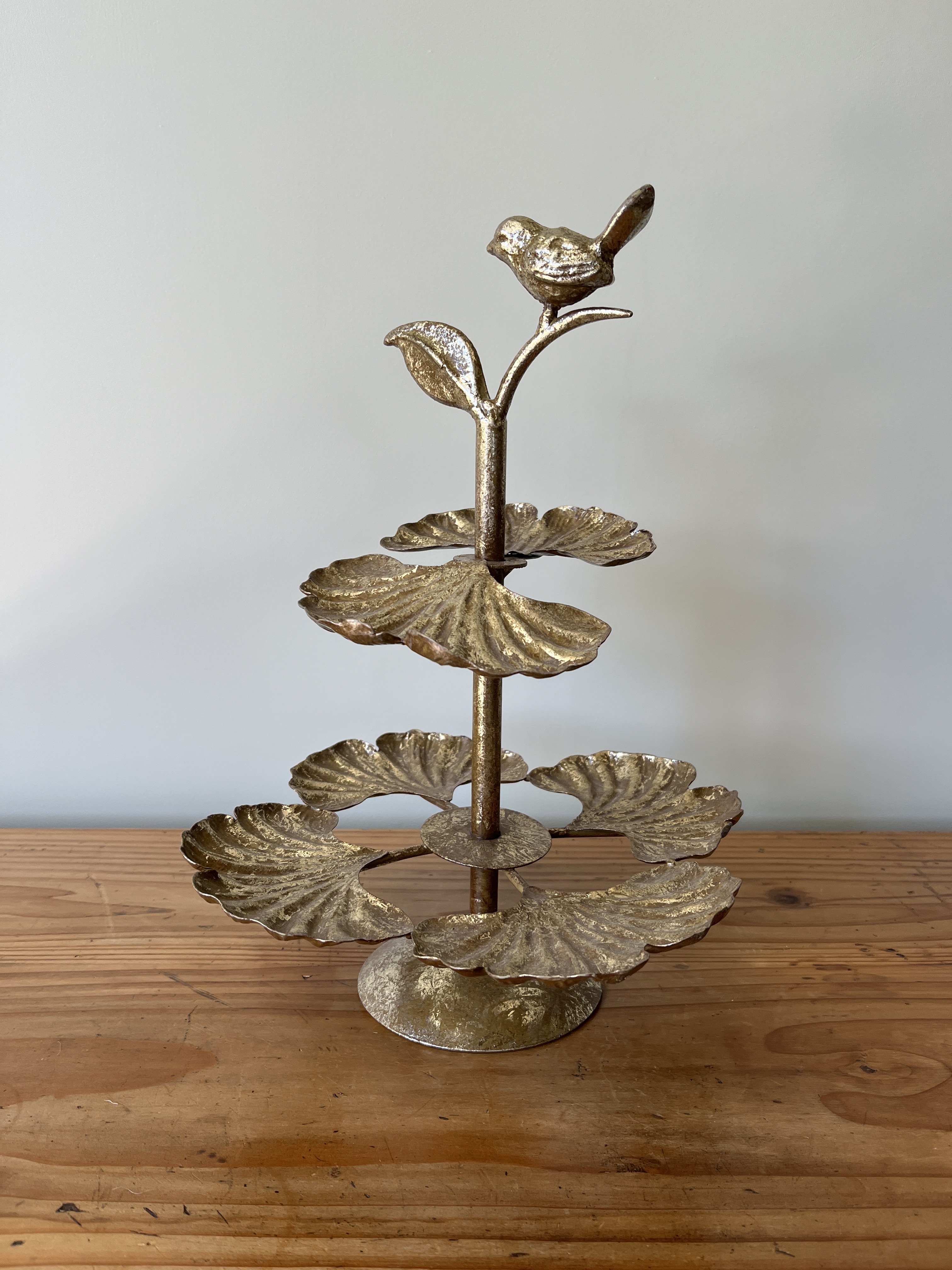 Bird on gingko stem cupcake stand, handcrafted in tin with an antiqued finish.
