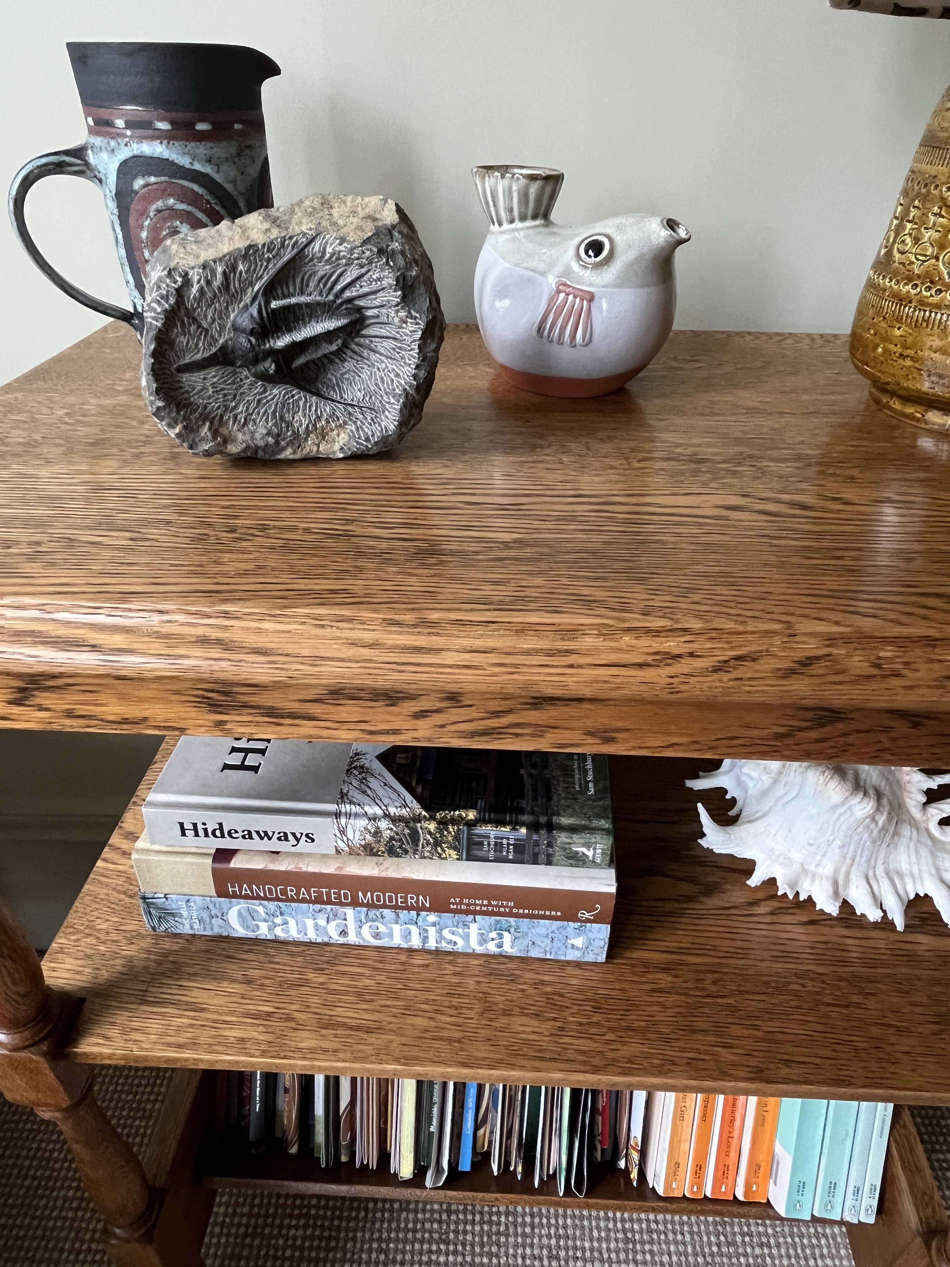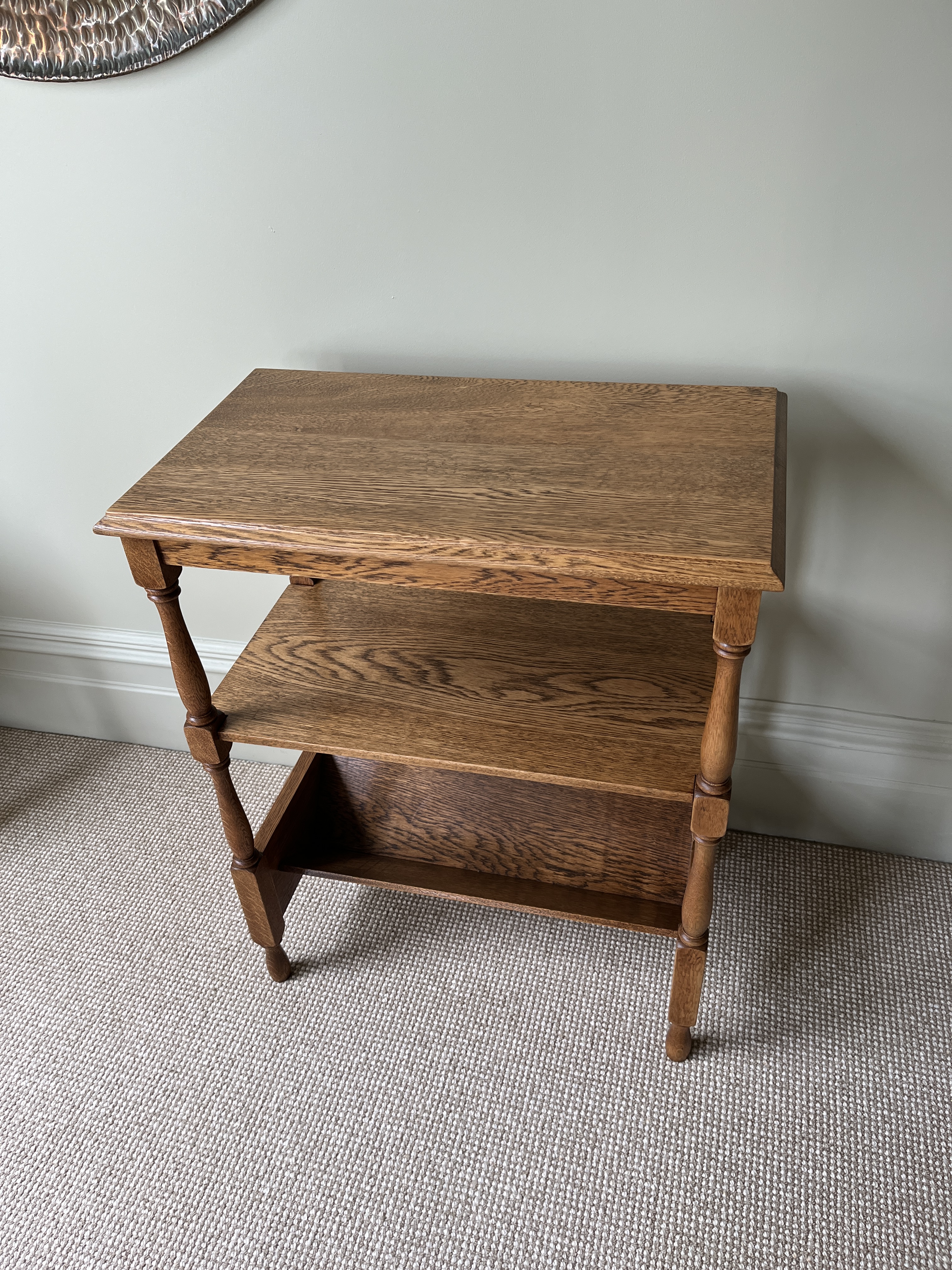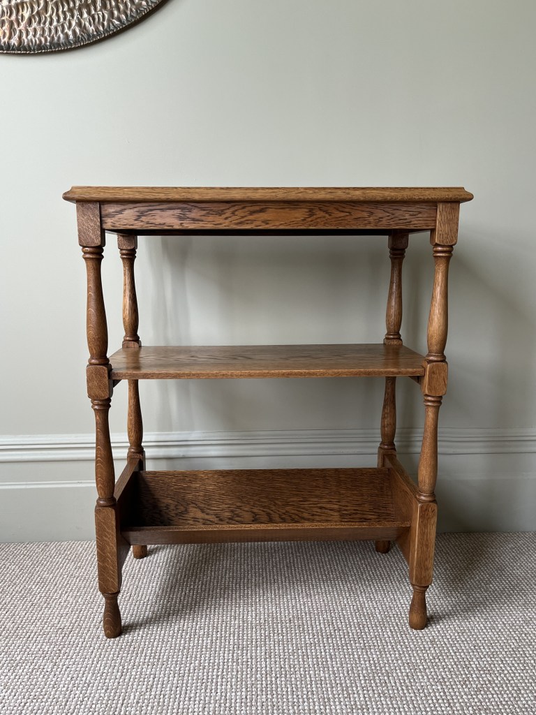 Arts & Crafts 3-tier oak whatnot with turned legs. The bottom tier is an angled trough, perfect for Penguin paperbacks. This is a handmade piece.